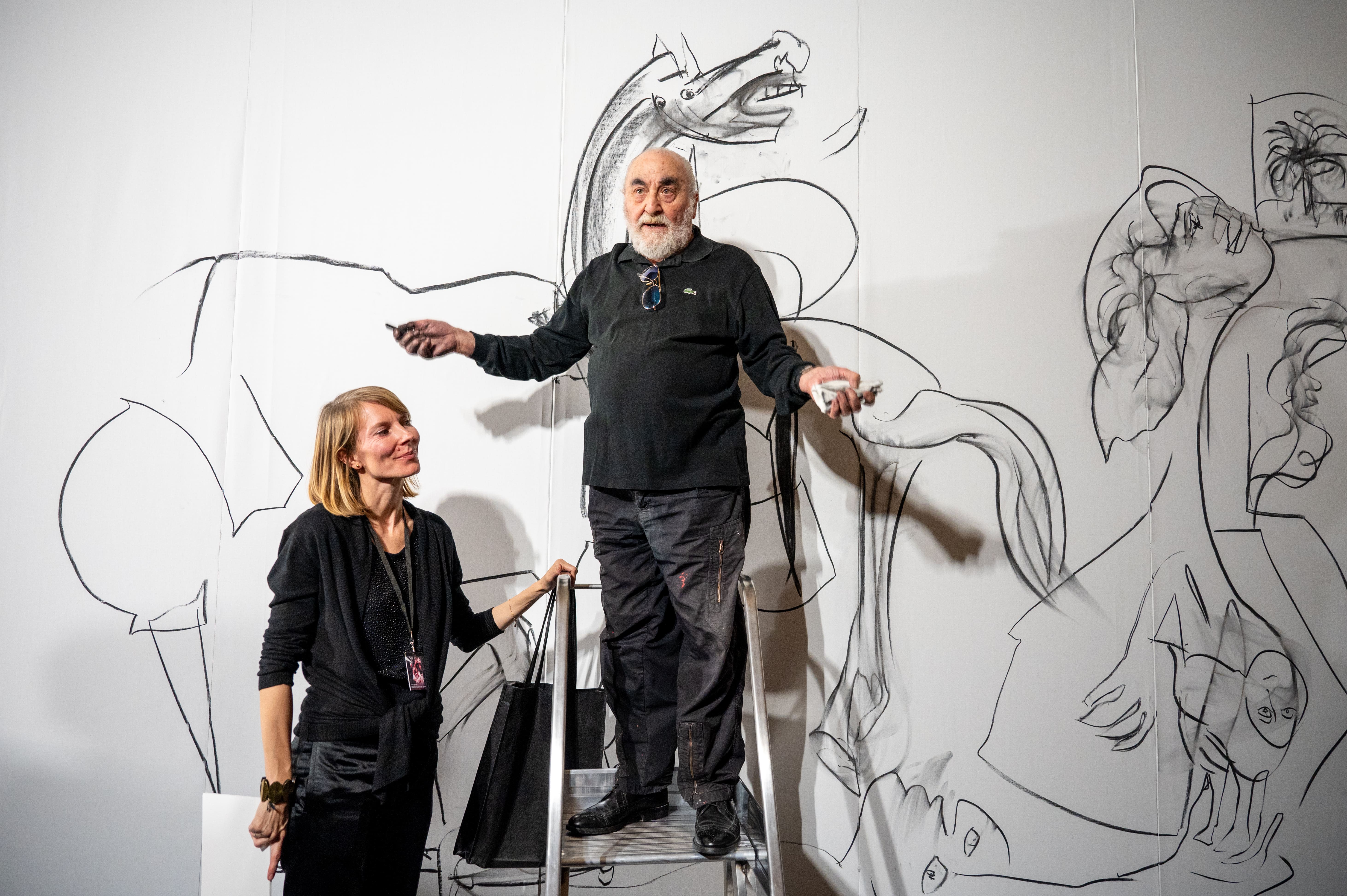 In 1953 Guernica’s great artwork from the MoMA of New York, where it had been kept since 1939, was exhibited at Palazzo Reale for the first time. The operation was made by Picasso’s own will, who found his natural frame in the Caryatids Hall still marked by the bombing. Seventy years later, to celebrate the moment which marked the history of Italian art and the history of Palazzo Reale as an exhibition venue, the artist Ercole Pignatelli reinterpreted Guernica, as a performance key, painting for twelve days, with his now famous gestural painting, a canvas of the same size. The intervention gives back emotions and thoughts that the masterpiece has aroused in the still 18 years old artist, filtered through the experience and the knowledgeable hand of his 88 years old.