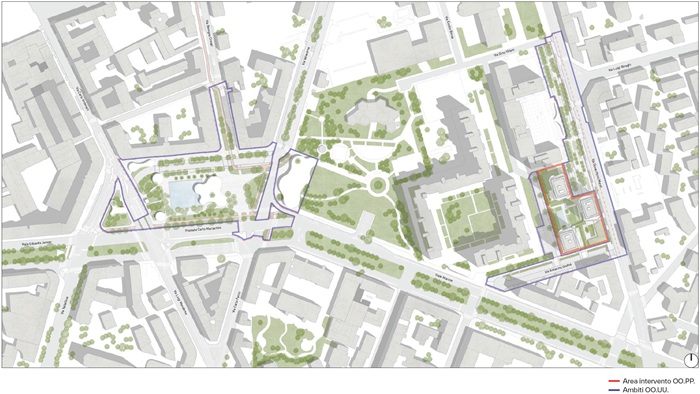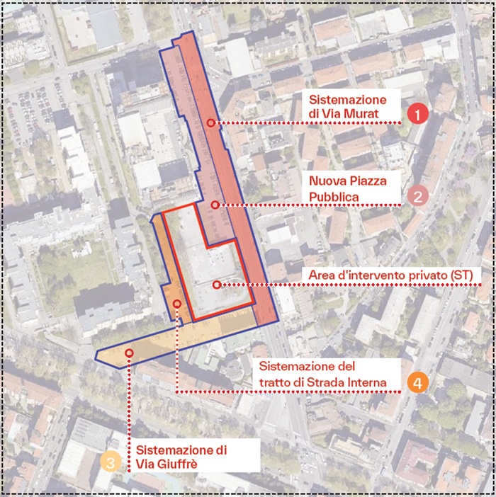 - via Murat: realizzazione di una nuova piazza pubblica pedonale a sostituzione del parcheggio a raso attuale, con spazi a verde e piantumazioni, aree pedonali pavimentate e aree dedicate alla sosta;