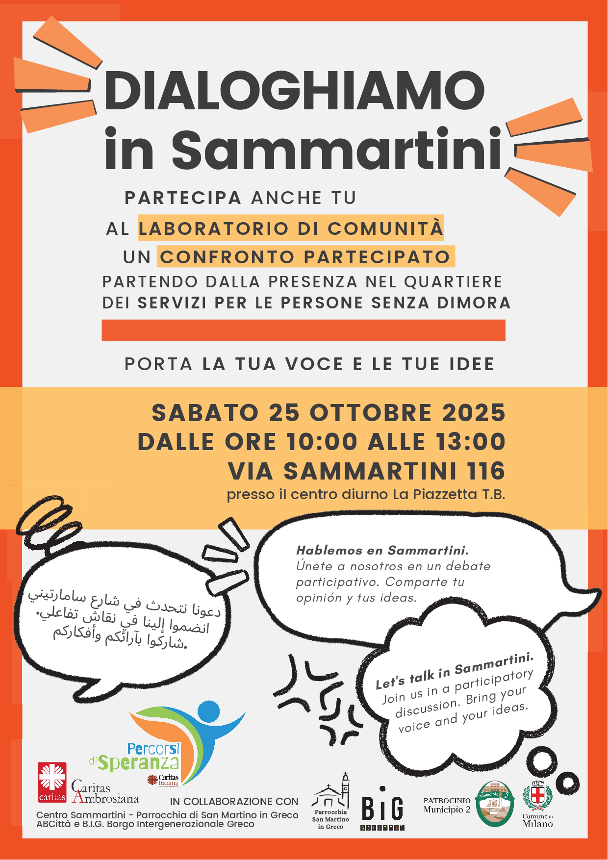 Invito al laboratorio "Dialoghiamo in Sammartini": Percorsi di Speranza – Inclusione e Dialogo nelle città metropolitane / Laboratorio di Comunità nella stecca Sammartini e Greco”.