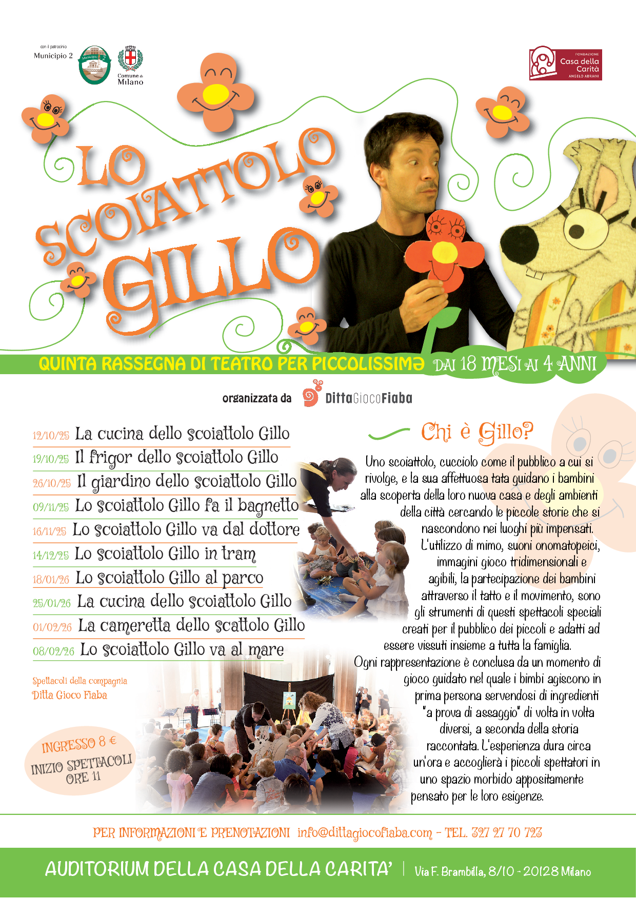 Per la quinta stagione la compagnia Ditta Gioco Fiaba organizza nel quartiere Adriano, nella sede dell'auditorium della Casa della Carità di via Brambilla 8/10 - a partire dal 12.10.2025, una rassegna di teatro dedicata alle famiglie con bambini dai 18 mesi ai 3 anni.