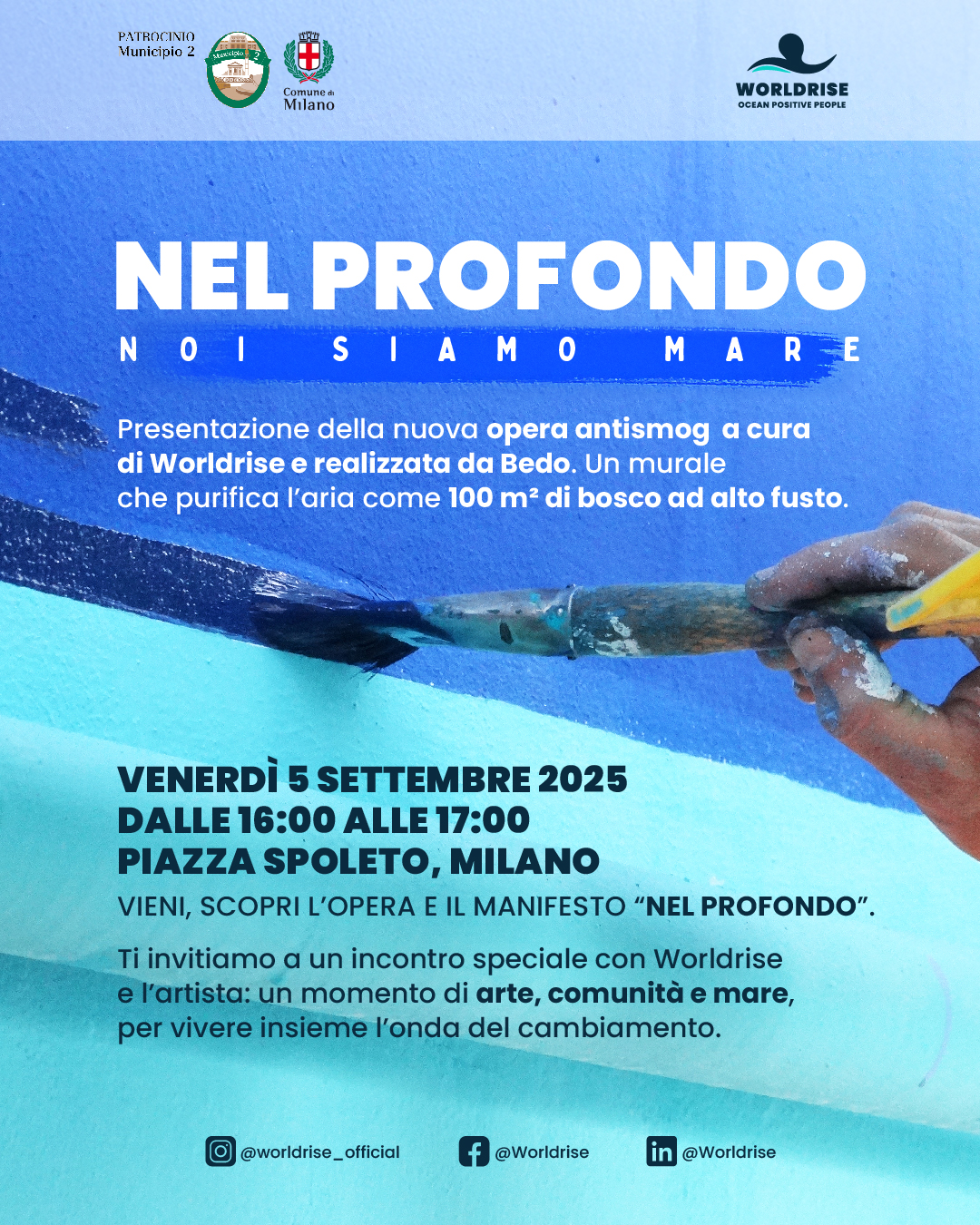 L'evento si svolgerà in piazza Spoleto, di fronte al murales realizzato dall'artista Bedo nell'ambito del progetto di Worldrise, e consiste nella presentazione e racconto dell'opera d'arte pubblica, con lo scopo di portare la voce del mare attraverso i muri del quartiere NoLo, comprenderne il significato e sentirsi parte del messaggio che essa porta con sè, valorizzando lo spazio urbano.