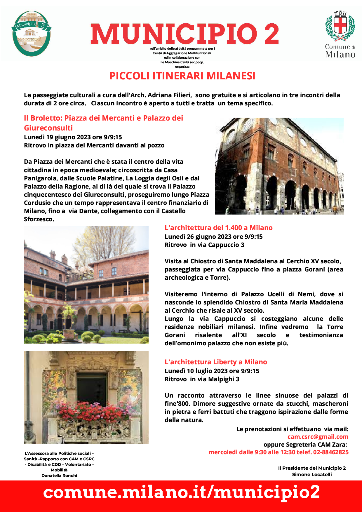 - L'architettura del 1.400 a Milano. Visita al Chiostro di Santa Maddalena al Cerchio, Palazzo Ucelli di Nemi e Torre Gorani - lunedì 26 giugno 2023 - ritrovo in via Cappuccio 3;