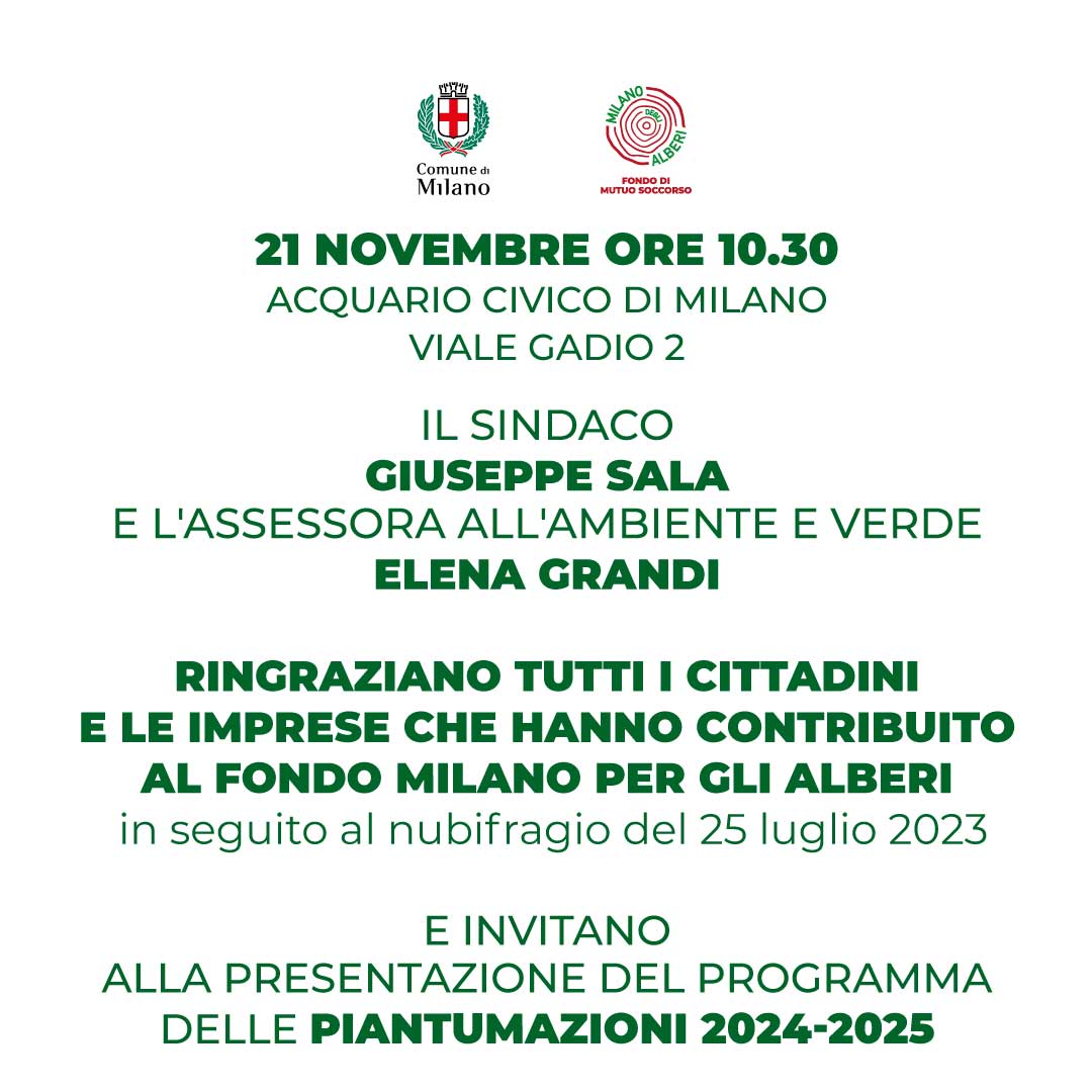 Il 21 novembre, in occasione della Giornata Nazionale dell’Albero, vi invitiamo a scoprire il programma delle piantumazioni 2024-2025 presso l’Acquario Civico, alle ore 10.30. Al termine della presentazione verrà messo a dimora un platano all’interno di Parco Sempione.
