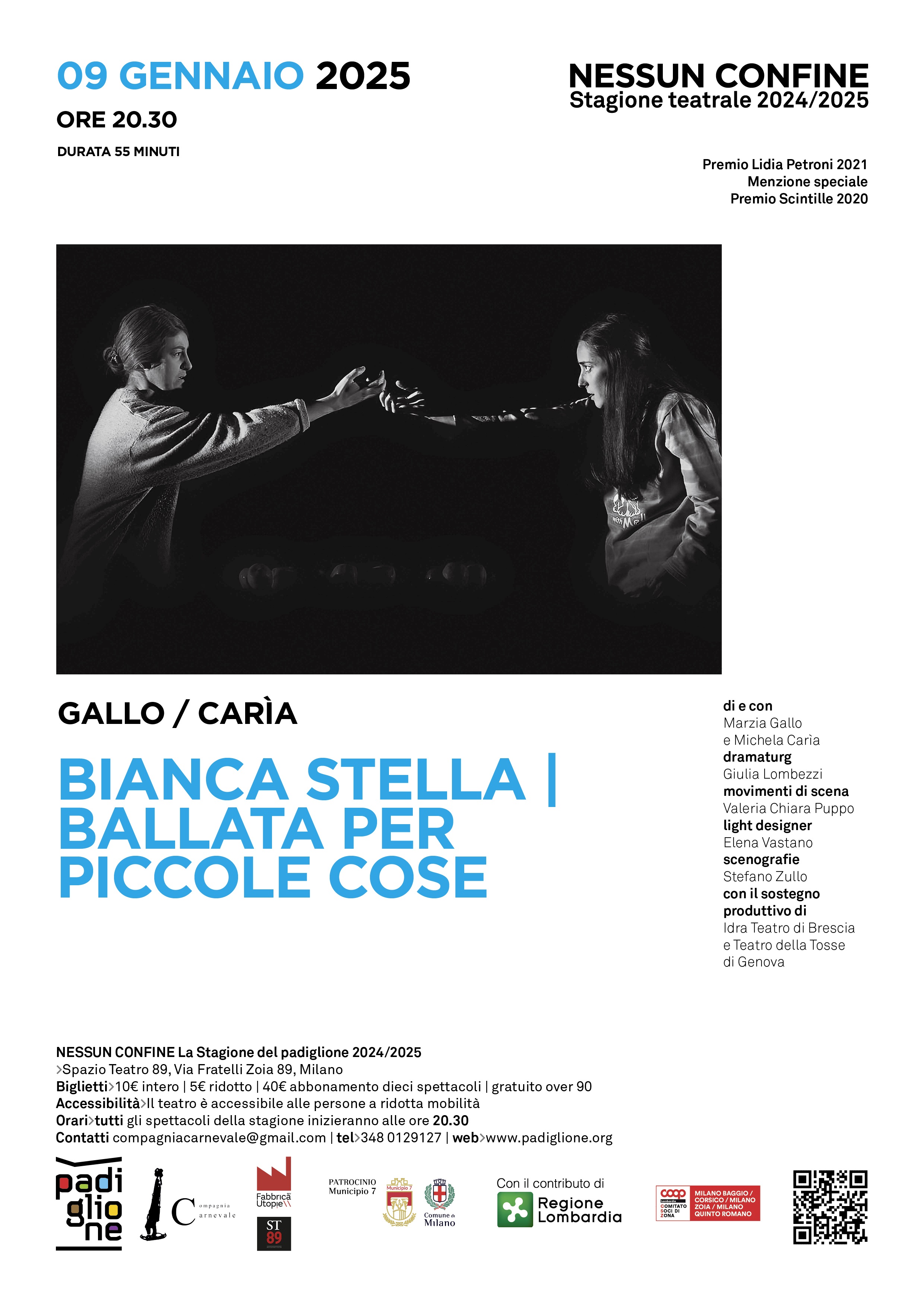 Giovedì 9 gennaio 2025 alle ore 20.30 presso lo Spazio Teatro 89, Via Fratelli Zoia 89, Milano, quinto appuntamento di Nessun Confine 24/25 - la stagione del padiglione 2024/2025, “Bianca Stella| Ballata per piccole cose.”