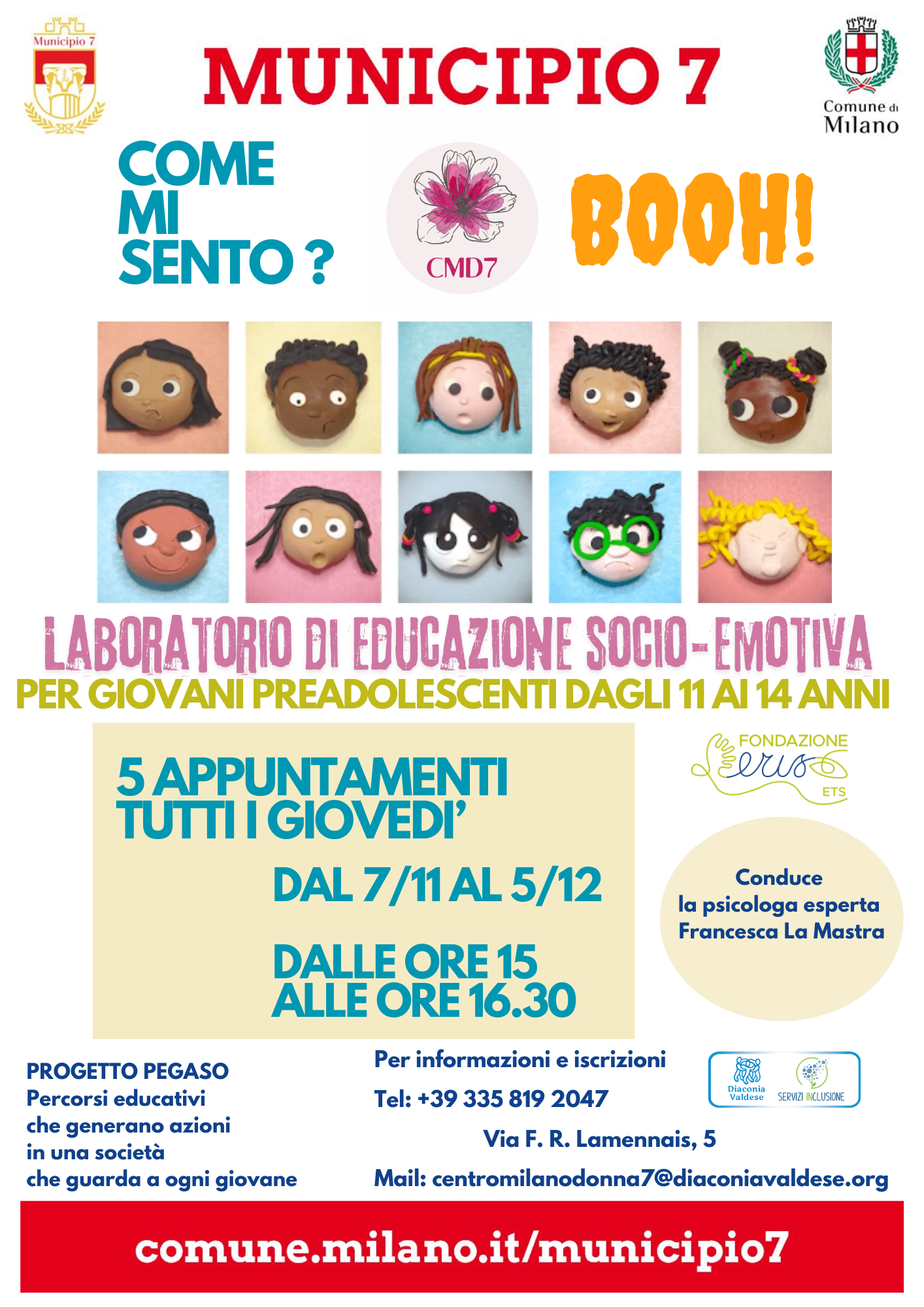 Oggi pomeriggio - dalle ore 15:00 alle 16:30, in via F. R. Lamennais n. 5 - avrà inizio il Laboratorio di Educazione Socio-Emotiva, rivolto ai giovani preadolescenti dagli undici ai quattordici anni.