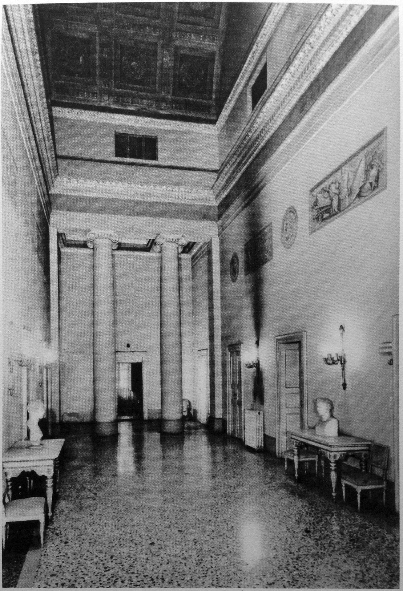 Il maestoso ambiente neoclassico, con le quattro grandi colonne con capitello ionico, richiama la partitura centrale della facciata di Palazzo Reale realizzata dal Pierimarini.